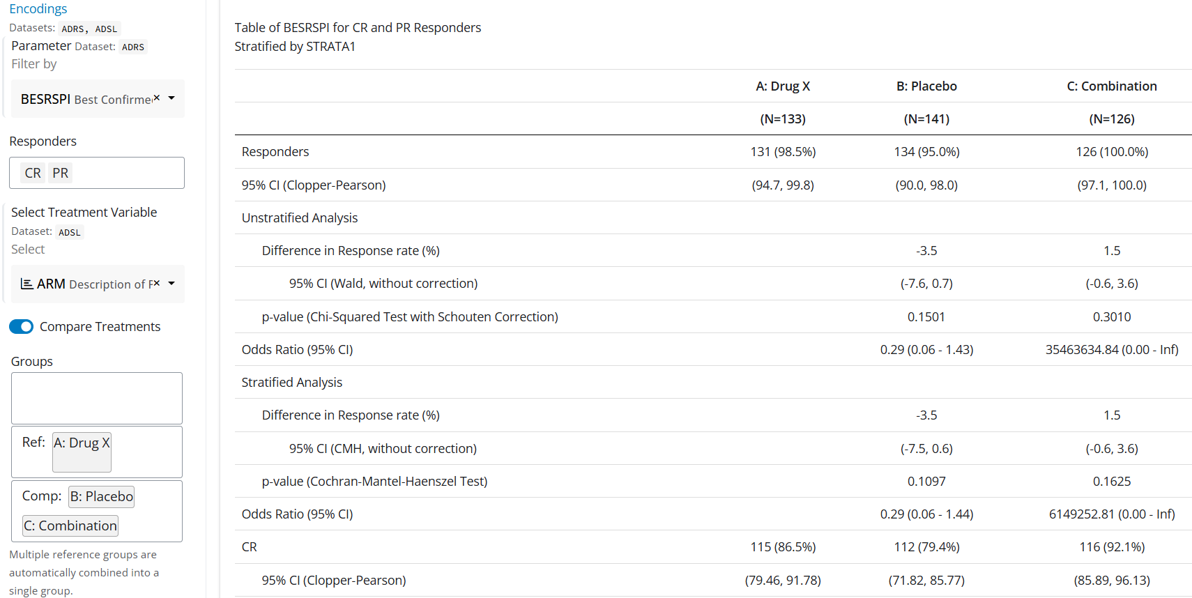 lyt <- rtables::basic_table(show_colcounts = TRUE, title = "Table of BESRSPI for CR and PR Responders", subtitles = "Stratified by STRATA1") %>% rtables::split_cols_by(var = "ARM") %>% tern::estimate_proportion(vars = "is_rsp", conf_level = 0.95, method = "waldcc", table_names = "prop_est", denom = "N_col")