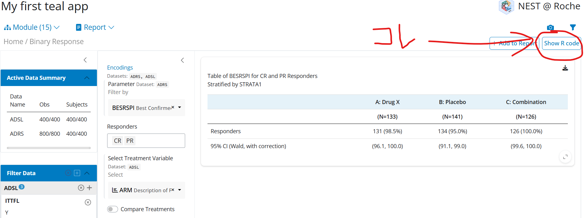 anl <- ANL %>% dplyr::mutate(ARM = droplevels(ARM)) %>% dplyr::mutate(is_rsp = dplyr::if_else(!is.na(AVALC), AVALC %in% c("CR", "PR"), NA)) %>% dplyr::mutate(AVALC = factor(AVALC, levels = c("CR", "PR", "SD")))